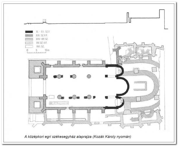 István király 1001-1010 között megalapította Szent János tiszteletére az egri püspökséget. A székesegyház építkezéseit a hagyomány szerint maga a király irányította a szomszédos Királyszék nevű dombról. Az építkezést 10-11 év alatt fejezték be, miközben a várost is fallal vették körül. Soós szerint e vár keleti oldalán felvonóhíddal ellátott kaput nyitottak, és innen mély árkon átvezető hidon lehetett az Almagyarra jutni. Ez időben vésték a sziklába a kb. 75 m mély, 2,5 m átmérőjű kutat. A Sáncban is folytak építkezések, ahol az őrség számára épültek lakóhelyiséget. Ez az építkezés 1047-ig tartott, amikor a fellázadt nép Vata vezetésével a még befejezetlen várat megrongálta. A hadi célokra még meg nem felelő várat 1241-ben a tatárok elfoglalták és a várossal együtt lerombolták.