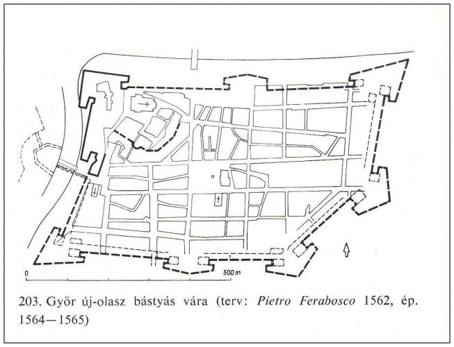 Az 1559. évi országgyűlés a legsürgősebben megerősítendő nyolc vár között sorolta fel Győrt. 1560-ban Francesco Benigno és Bernardo Gabellio irányításával megkezdődött az építkezés. A várfalakhoz szükséges téglákat a Rába és Rábca által közrefogott Szigeten égették. Egy jelentés szerint 1561-re kialakult a várfalak és bástyák nyomvonala.