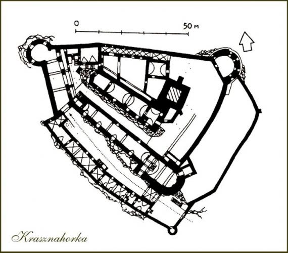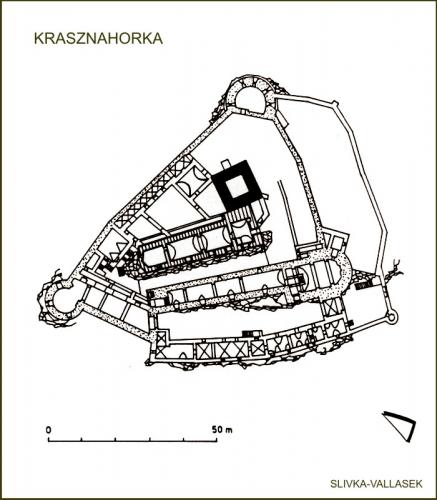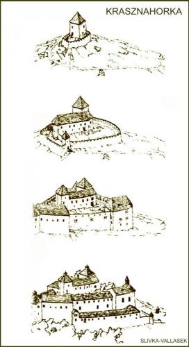 Krasznahorka várának háromszög alakú tömbje egy 500 méter magas, meredek oldalú hegy tetején épült fel a XIV. század elején. Legrégibb része, a régészeti kutatások szerint, a 10,5 x 9 méter külső méretű öregtorony volt, amit talán fal övezhetett. Ezt bővítették ki a XIV. század derekán egy 40 méter hosszú palotaszárnnyal és újabb kerítő falakkal. Ezen épületszárnyakat a Bebek és Andrássy főnemesi családok birtoklásának évszázadai alatt további rondellákkal {ágyúbástyákkal} erősítették meg. A véres csatákat és hadjáratokat csodálatos módon túlélt erődítmény, a környező vidék oly sok várával ellentétben, a 2012-es tűzvészig teljes épségben állta a régmúlt időkre kíváncsi látogatók hadát.