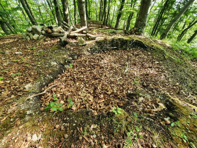 A sziklagerinc keskeny platóján (30 x 7 m) előkerültek egy kisebb épület nyomai. A várat keletről és délről árok és sánc védte, amely árok ma is 8-10 méter széles. A meredek nyugati oldalon nincsenek védművek nyomai a felszínen. A várat az északi végén a meredek sziklagerinc határolja. A déli oldalt az említett árok-sánc védműtől déli irányban kb. 30 méter távolságra egy kisebb szikla mellett levő plató, mintegy külső vár védte, amelyet tőle további 15-20 méterre délre, egy alacsonyabb szinten fekvő árok és sánc kerített. A vár teljes külső mérete 120 x 60 méter lehetett.