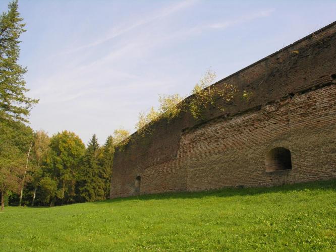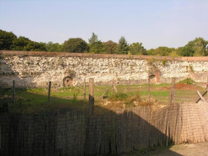 E kettős belső vár északi és keleti oldalán a tóvá bővített Almás-patak vize és a környező mocsaras rész, míg a déli és nyugati oldalát az Almás-pataktól táplált vizesárok védte, melynek szélessége 15-20 métert, a mélysége pedig a 4 métert is elérte. A belső vár bástyákkal kialakított sarkait összekötő falak földfalak voltak, kétsoros gerendázattal, sövénnyel fonva, melyek közét keménnyé döngölt föld töltötte ki. A földfalak tetejére még egy gerendákból rótt fal is épült, kettős fonott sövénnyel. Ezeket vaskapcsokkal fogták össze, közüket pedig szintén döngölt földdel töltötték ki. A belső várat a külső várral a vizesárok átvezető fahíd kötötte össze A külső várban különböző lakó-és gazdasági épületek és egy szárazmalom épült. Az itteni sarokbástyákat a belső várhoz hasonló és építésű földfal kötötte össze.