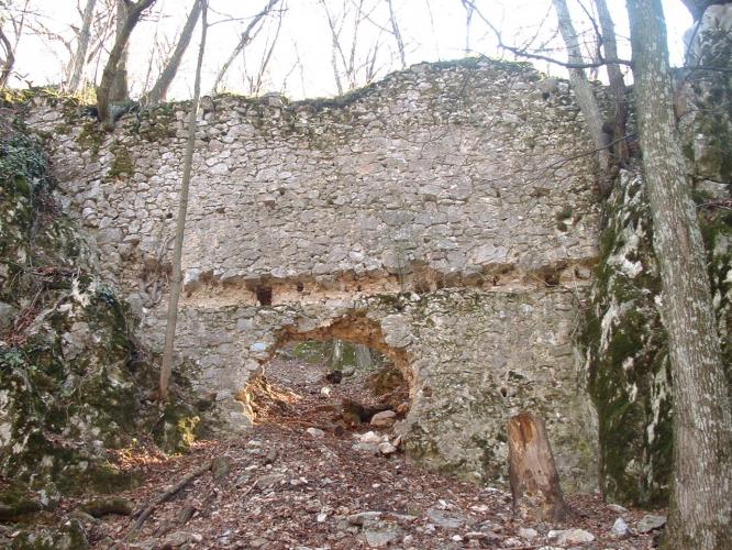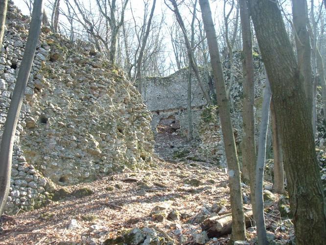 Legkívül egy kis sorompóval ellátott kerítés állta el az utat. A feltételezhetően fatörzsekből, vesszőkből összerótt védőműveknek napjainkra már nyoma sincsen. Tovább haladva a déli hegyoldalon vezető úton érkezünk meg az egykor szárazárokkal oltalmazott várkapuhoz, melyet felvonóhíd biztosított.