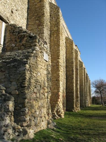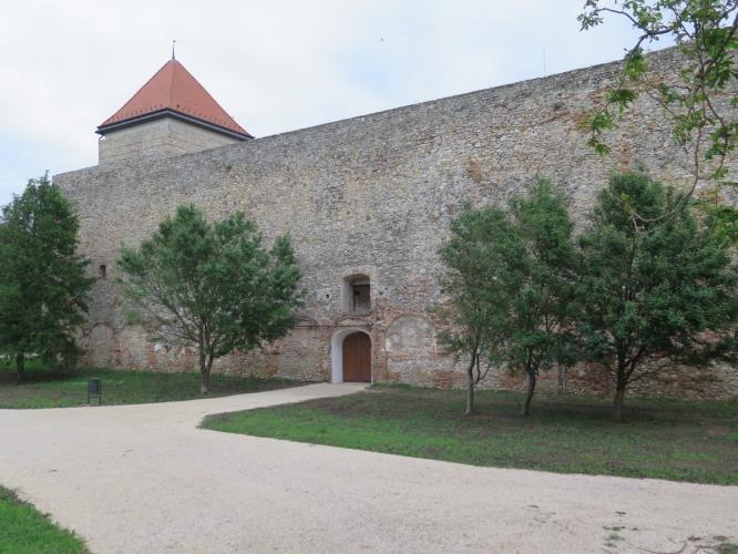 A rajz és az újabb feltárások adatai a várat legkívül nagyjából a mai parkot övező kőkerítés helyén palánkfal vette körül. Ezen belül ellenlejtős vizesárok partja, majd maga a megközelítően 20 m széles vizesárok következett, amely helyenként lejtővel, másutt anélkül a külső, ma már nem látható falig terjedt. A vizesárok a vár mögötti északnyugati völgyből kapta vizét, amely már a palánkon kívül két ágra szakadva töltötte meg azt. Feltehetően a lejtős terep miatt kellett a vár déli oldalát külső támfalszerű, íves fallal körülvenni.