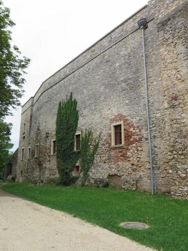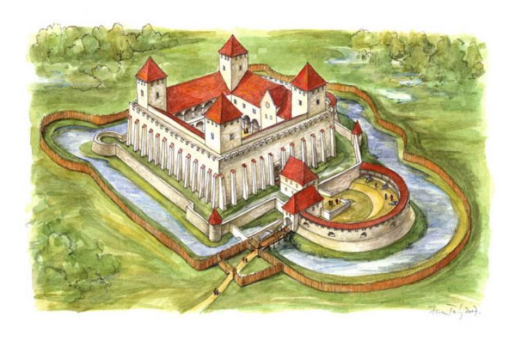 A várárkon belül elhelyezkedett külső fal ma már nem látható. A külső falat több helyen védték kör alaprajzú tornyok, így az északi sarkon, a keleti oldalon a nagyméretű rondellák, és a déli oldalon a kaputornyot biztosította a kb. 50 m átmérőjű köralaprajzú barbakán. Ezeken kívül több kisebb méretű, kör alaprajzú torony helyetkedett el a védőfalban. A vár területérekét híd vezetett. Az egyik a keskenyebb, feltehetően a gyaloghíd, míg a másik a szélesebb, a kocsihíd. Ez utóbbinál a rajzon egy fal látható, amely valószínű a zsilipet foglalta magába. Az alaprajz a kocsihídnál L alakban elhelyezkedő két téglalap alakú építményt jelöl meg, melyek a vár bejáratához vezetnek. Valószínű, a két építmény közül az egyik a kaputorony, a másik a kapuudvar lehetett. A bejáró délkeleti sarkában a régi felvonóhíd láncainak kőbevésett helye ma is látható. A kettős kapun keresztül a várudvarba jutunk. A vár négy sarkán eredetileg egy-egy négyzet alaprajzú torony állt, melyekből ma már csak a déli és a délnyugati emelkedik a várfal fölé. A tornyok külső oldalát helyenként 5 m vastag falak kötik össze. A tornyok között különböző rendeltetésű épületek vannak, míg a kapubejárat felöli kétemeletes rész XVIII. századi eredetű. Maga a palota, a mai déli szárny földszintjének keleti részén, ettől északkeletre pedig a kápolna helyezkedett el.