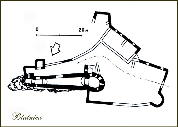 Az 500 méter tengerszint feletti magasságban csobogó Blatnica patak völgye fölé emelkedik a 685 méteres hegycsúcson álló Blatnica vára. Rövid, de meredek gyalogúton jutunk fel a községből az alsóvár kőfalában nyíló kapuhoz, amelyet a Ny-i sarkon egy félkörös torony védelmezett.